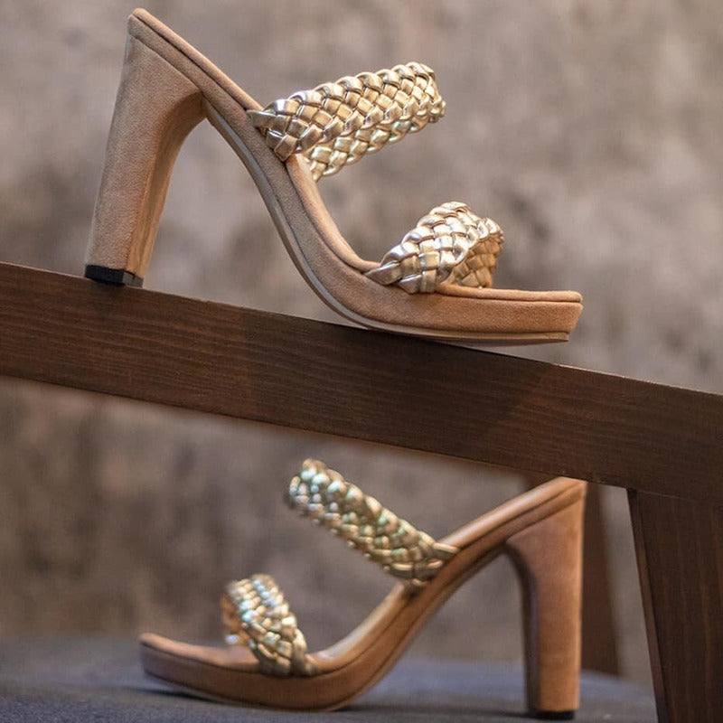 Descubre la elegancia y el brillo en cada paso con nuestras zapatillas Bélgica Oro, diseñadas para lucir espectacular en cualquier ocasión. Su doble tira trenzada en tono dorado aporta un toque sofisticado y moderno, mientras que su tacón alto estiliza al máximo tu figura.
