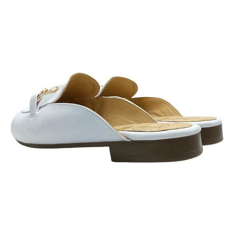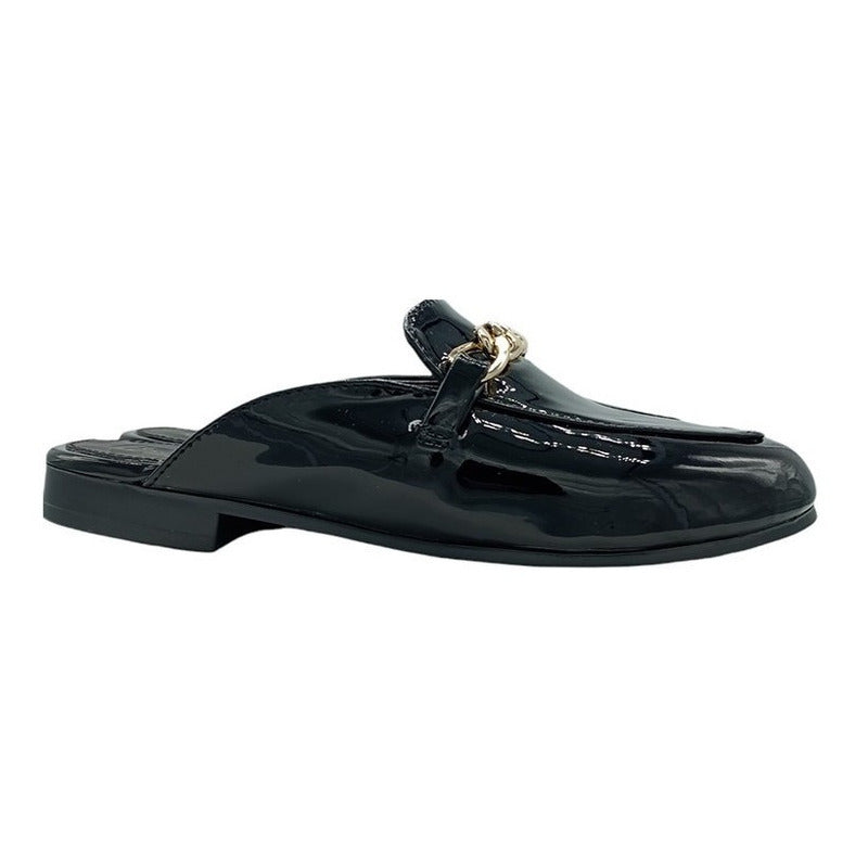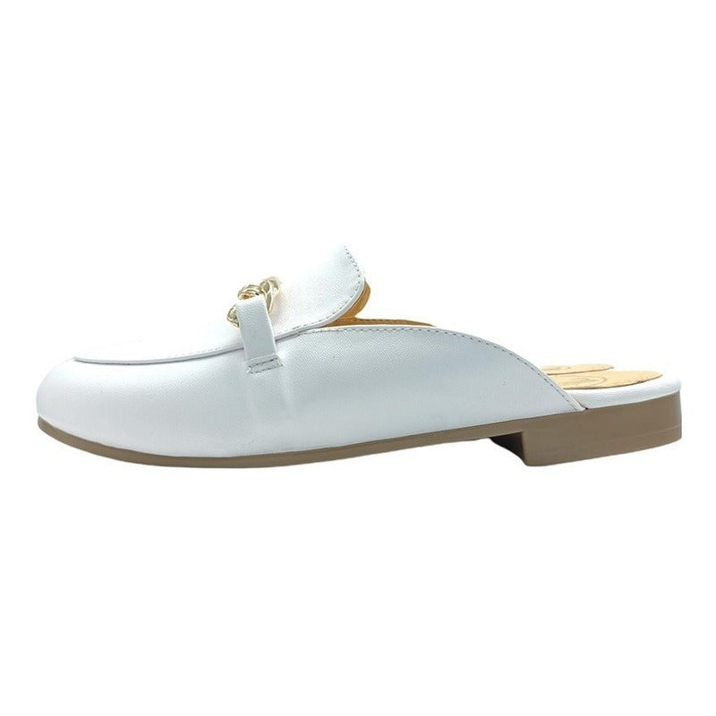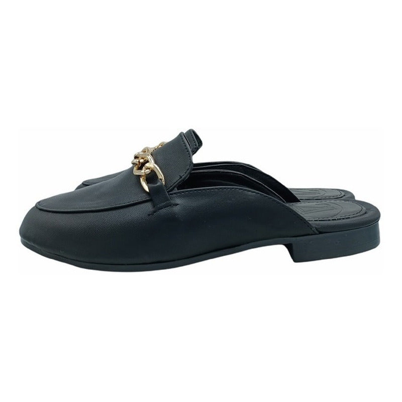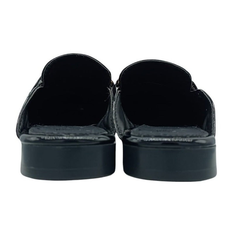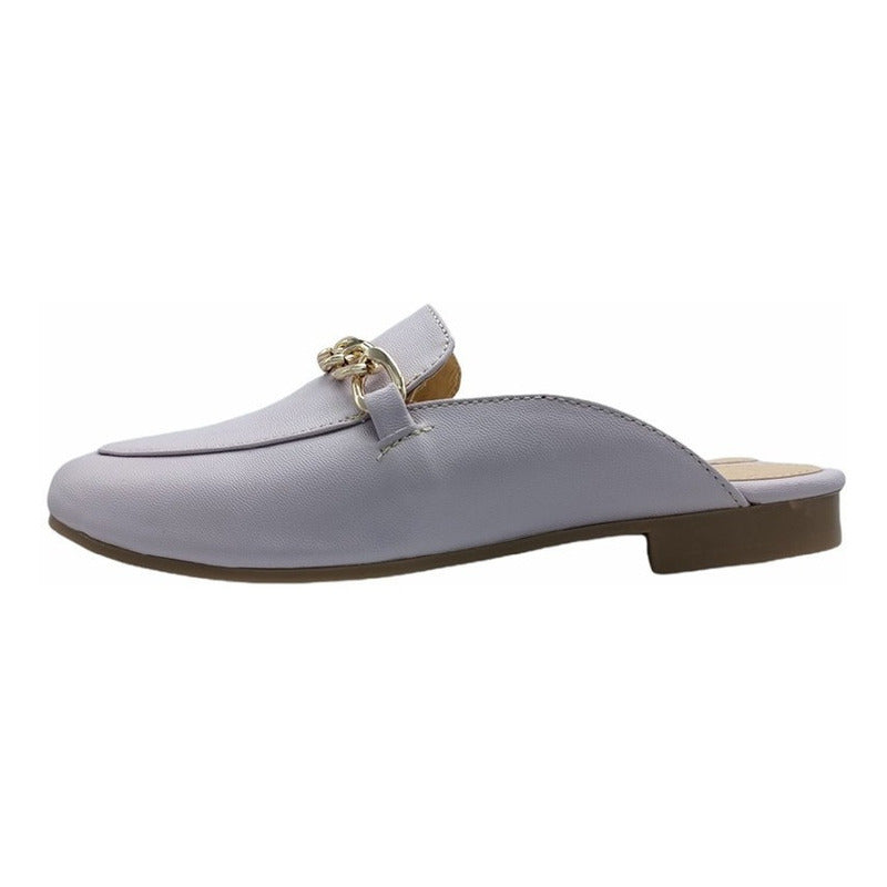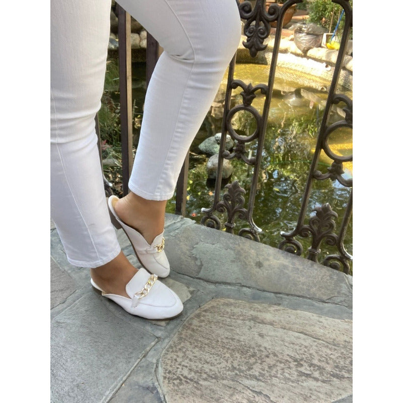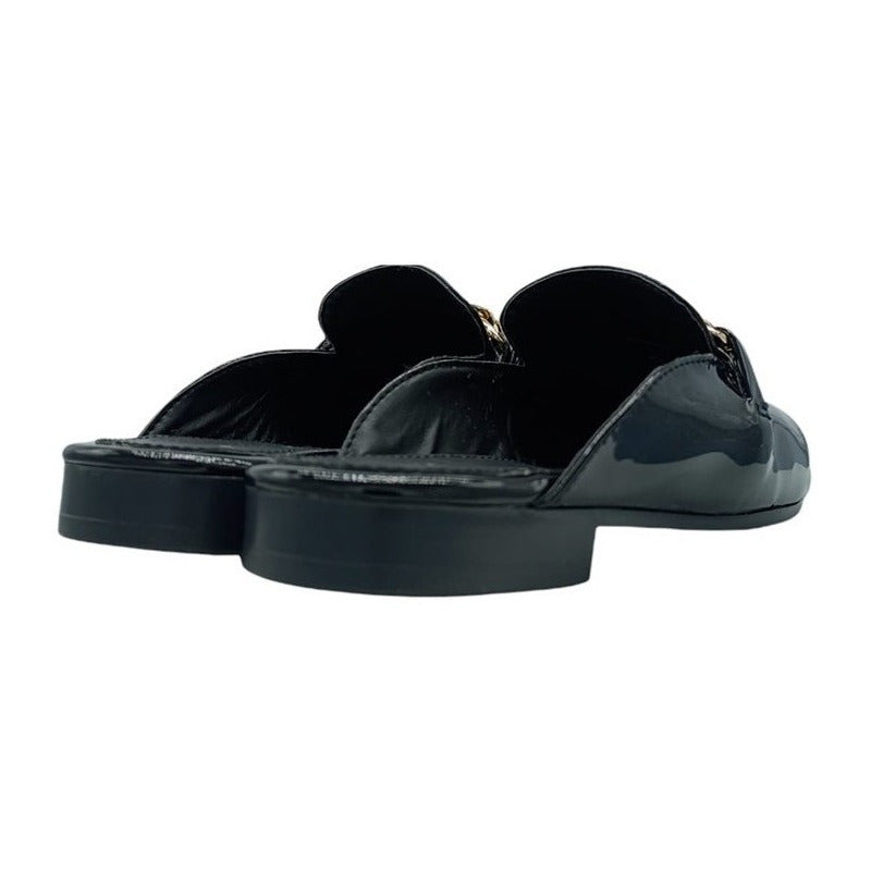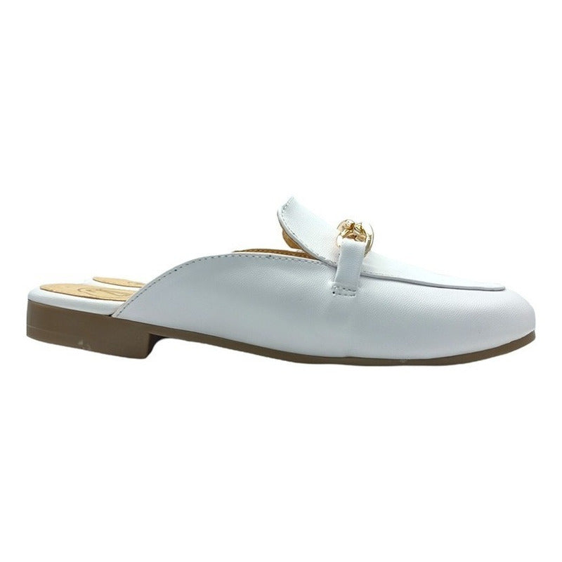 Mules slip-on realizados con piel sintética con herraje al frente.
