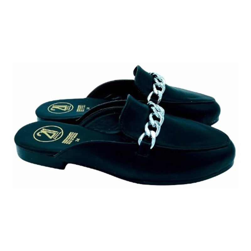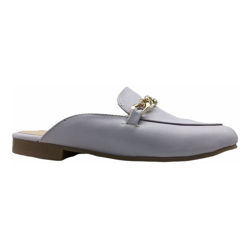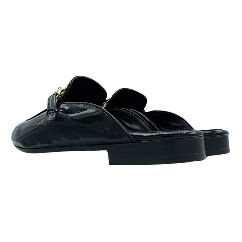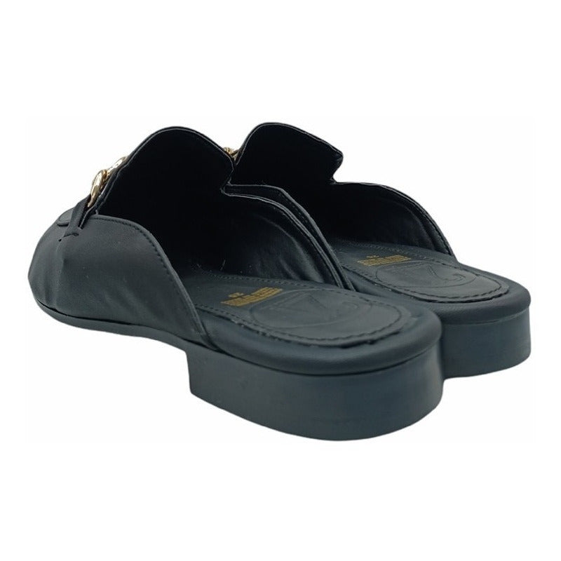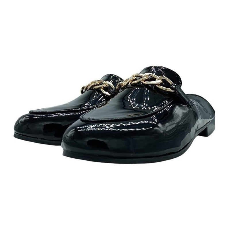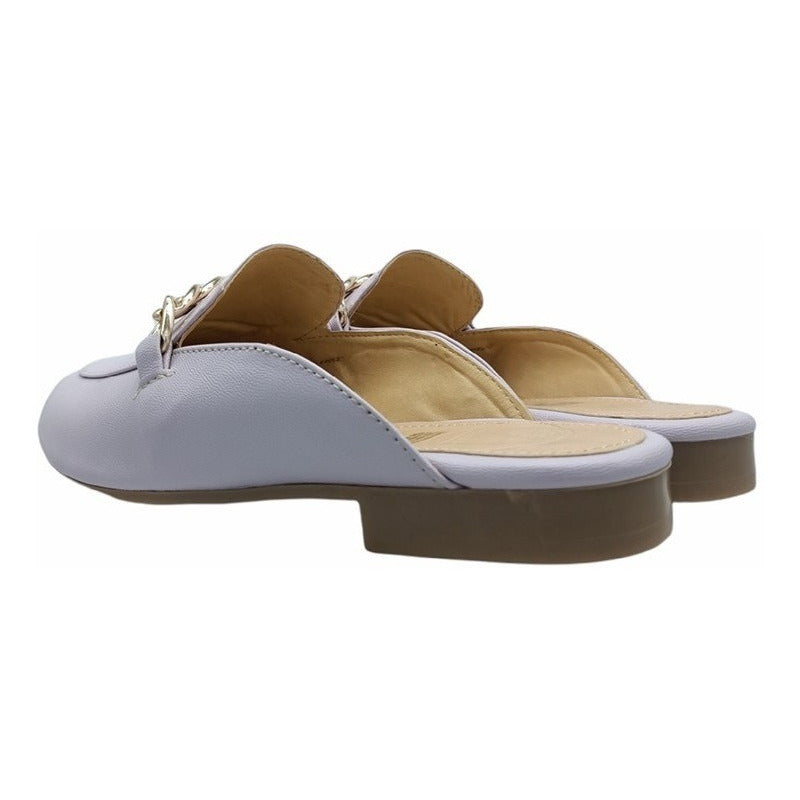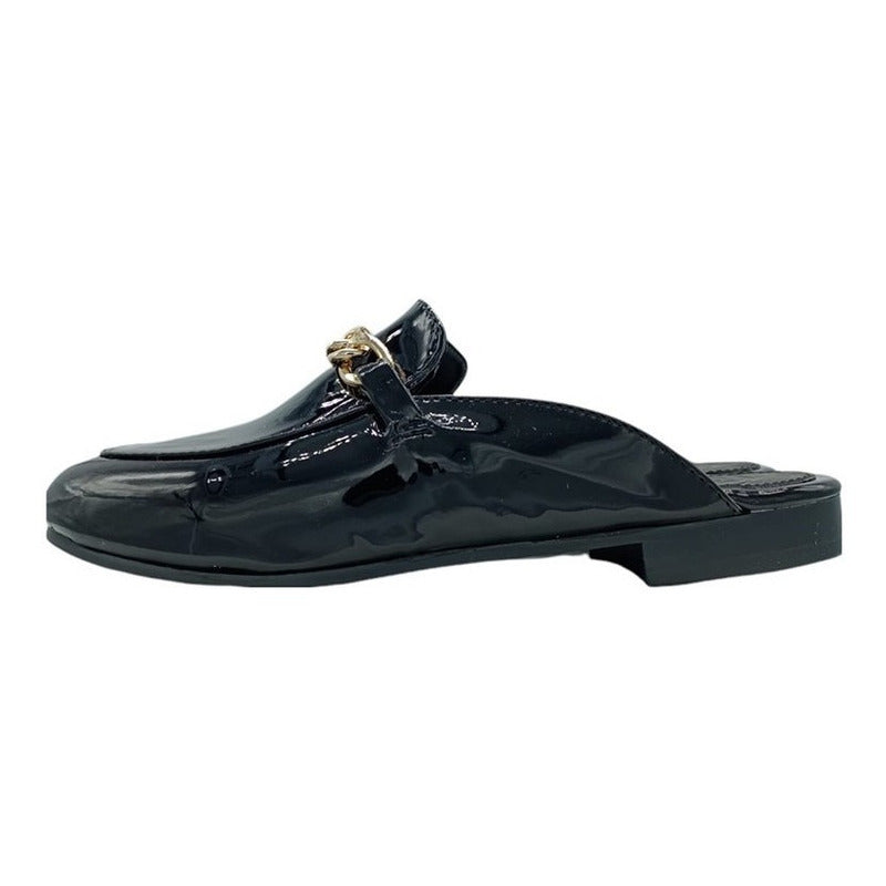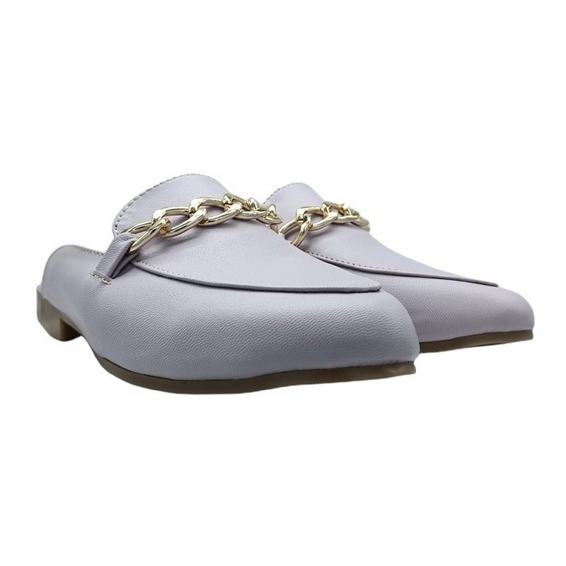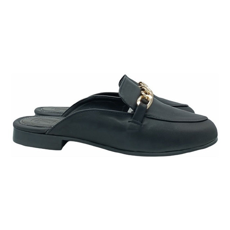 Mules slip-on realizados con piel sintética con herraje al frente.