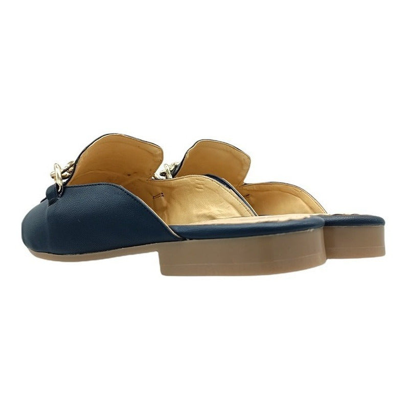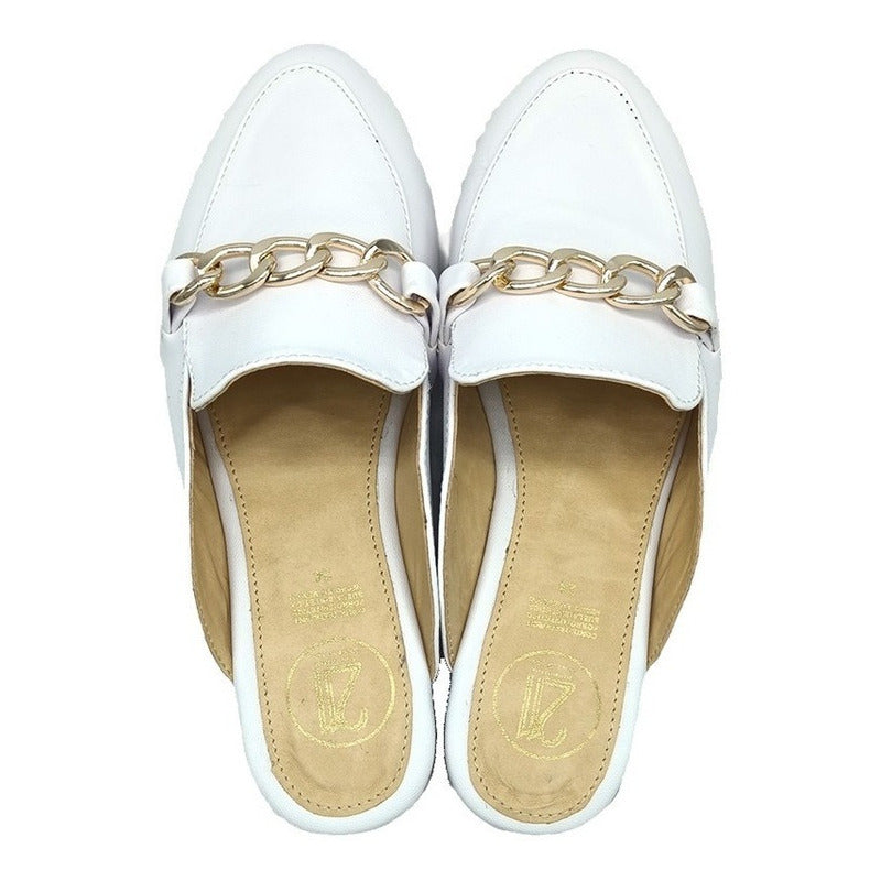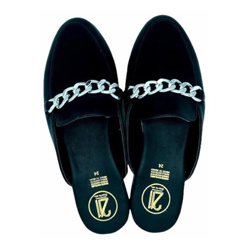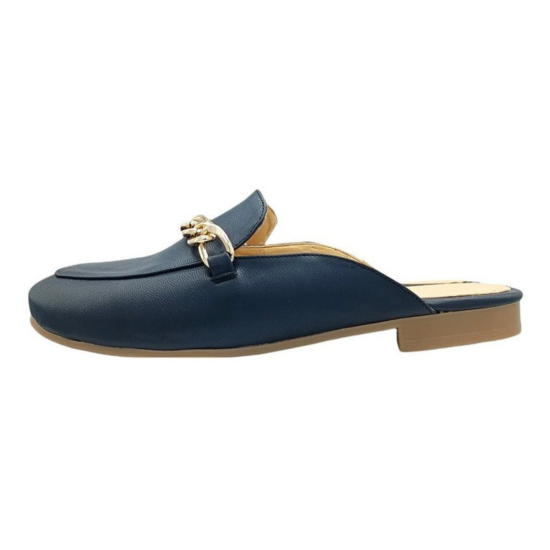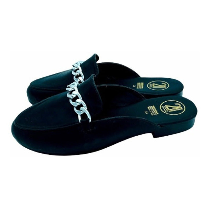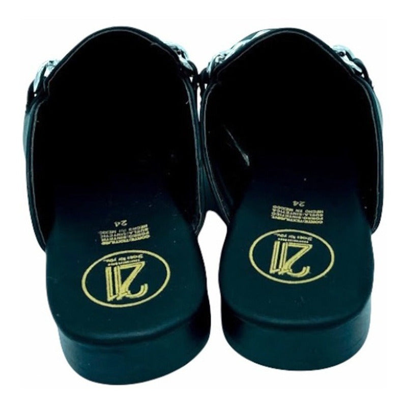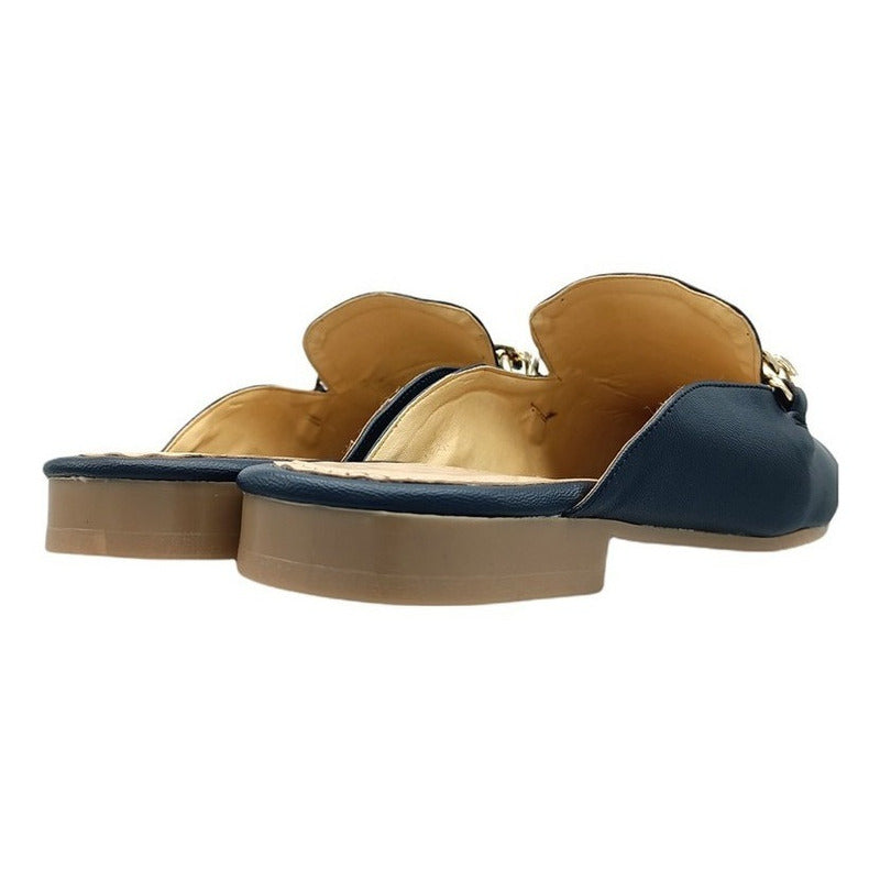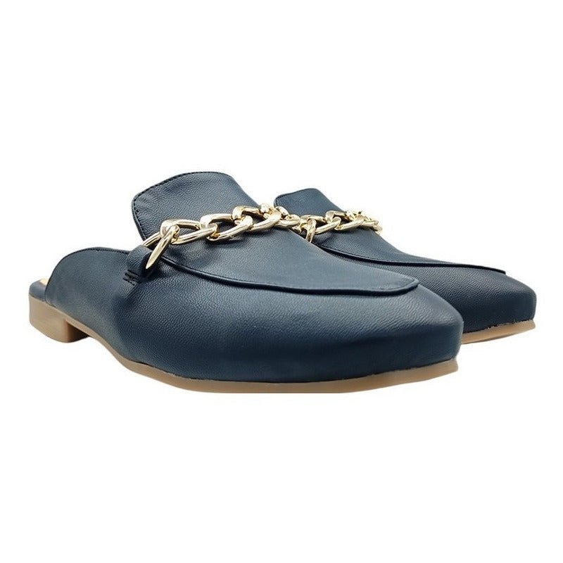 Mules slip-on realizados con piel sintética con herraje al frente.