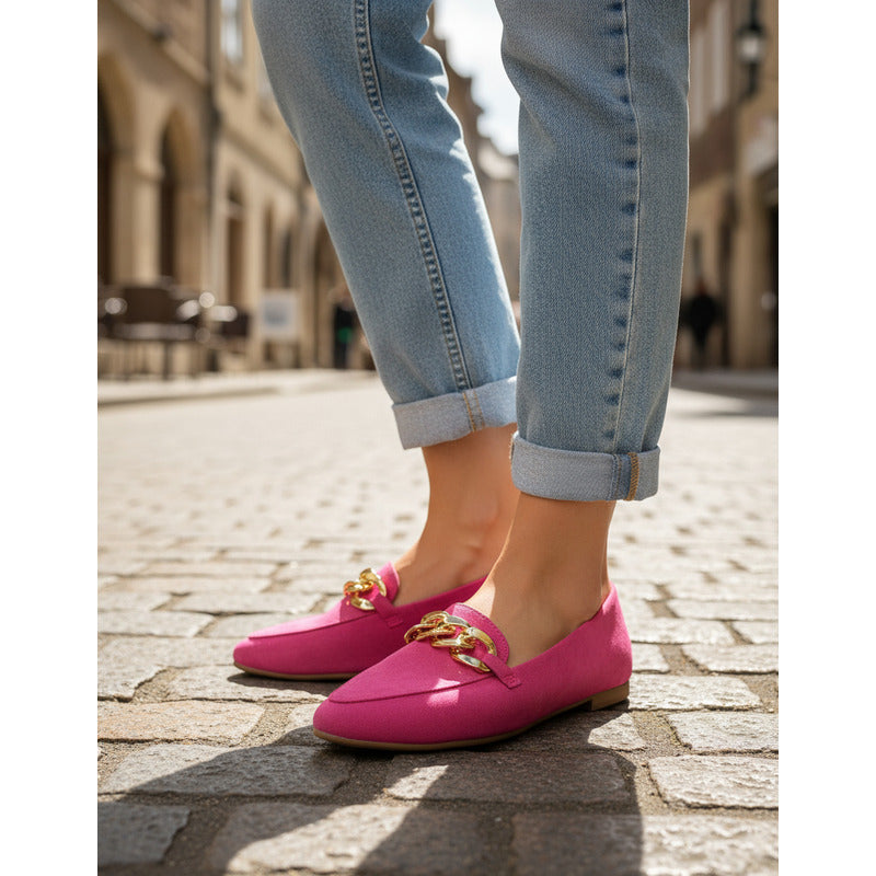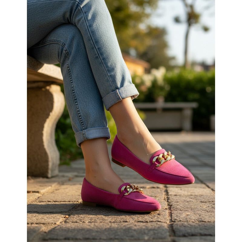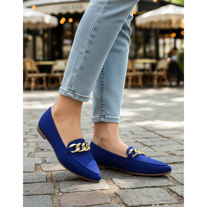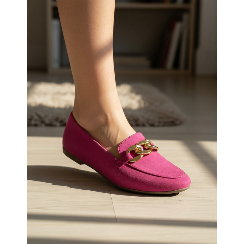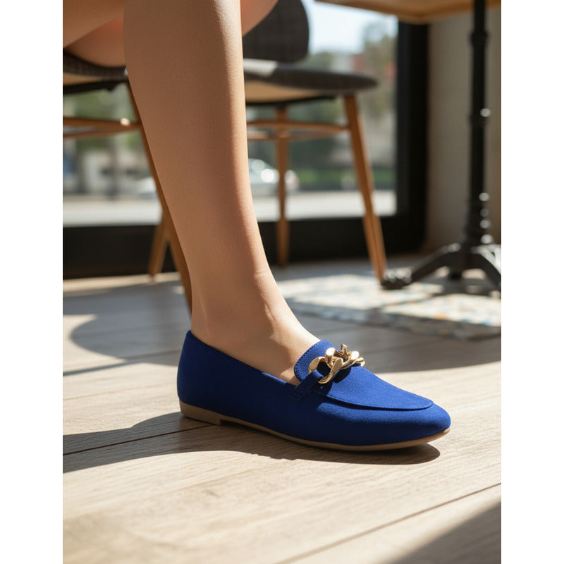 HERMOSAS Y COMODOS FLATS/ZAPATOS PISO EN COLOR ROSA FLAMINGO O AZUL COBALTO CON DETALLE DE CADENA.