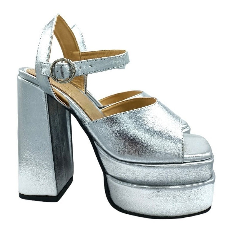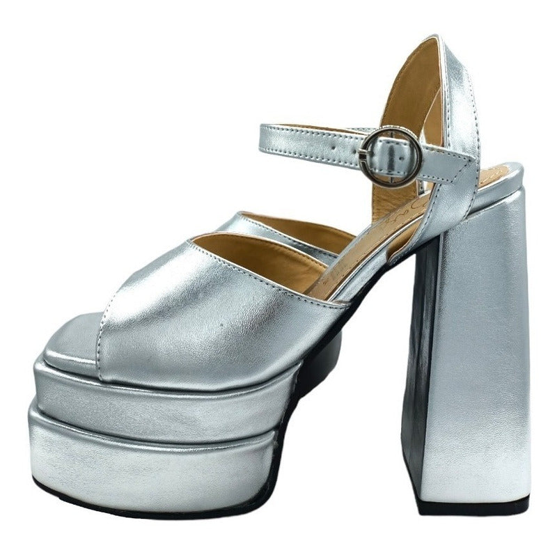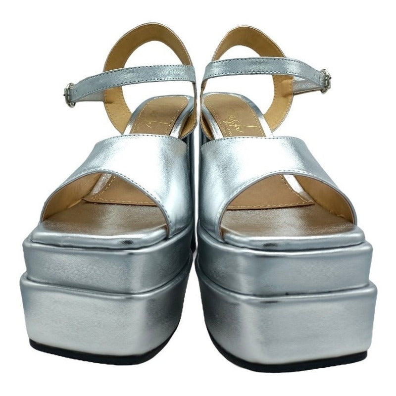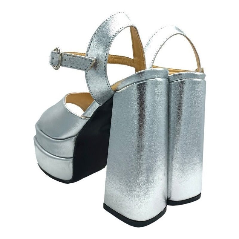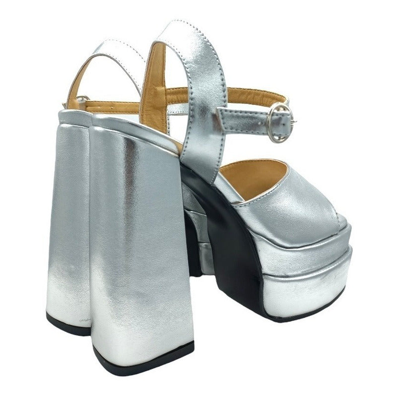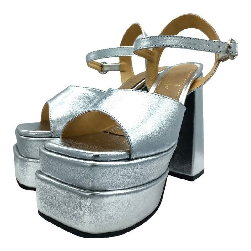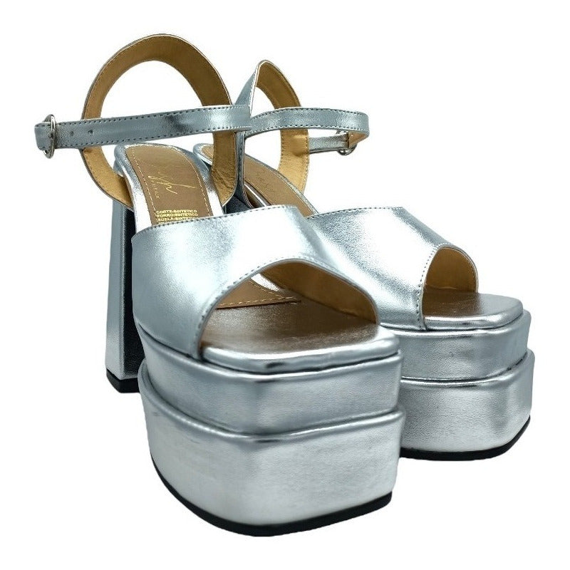 Sandalias con doble plataforma y tacón grueso que dan estabilidad y confort. Forradas en material sintético con terminado metálico. Punta cuadrada abierta y pulsera ajustable. Alto 13 cm.