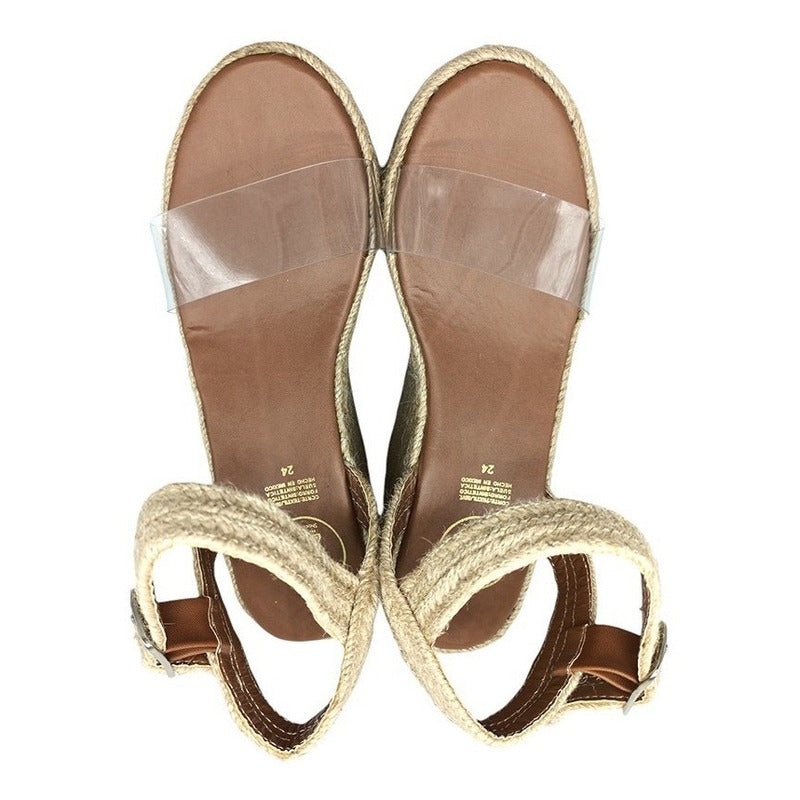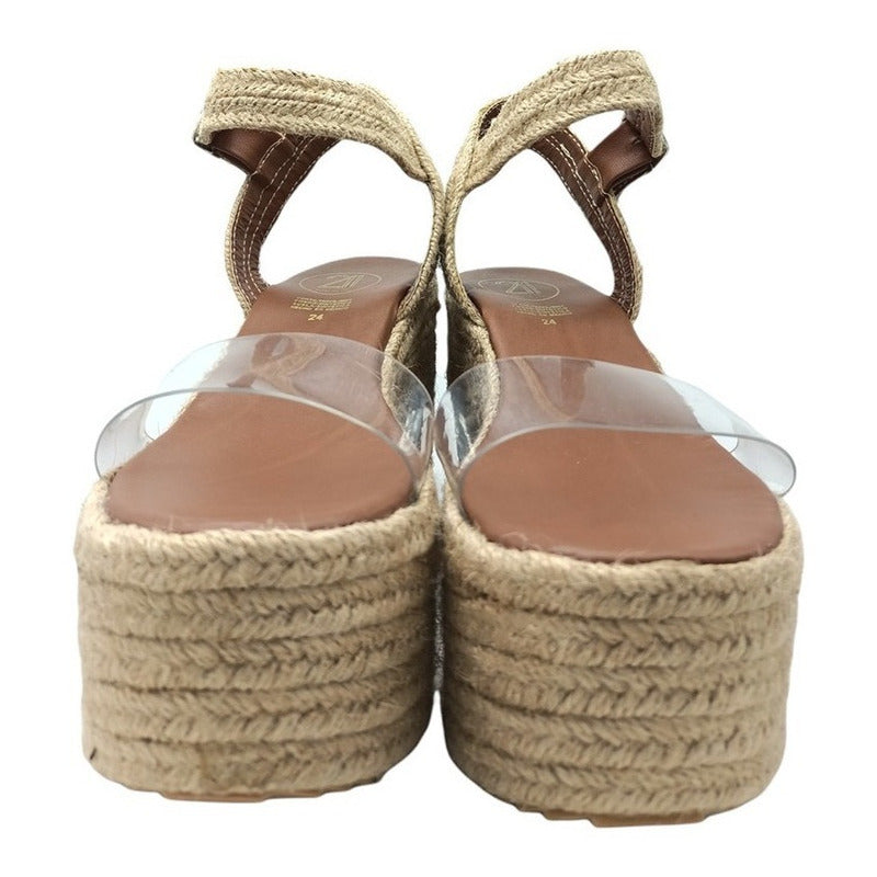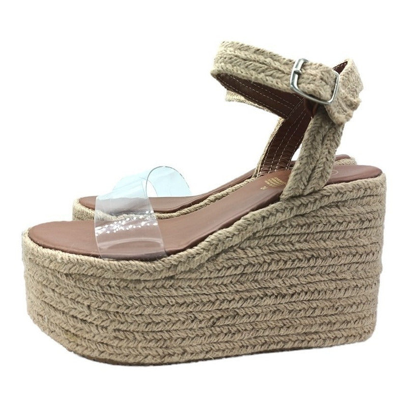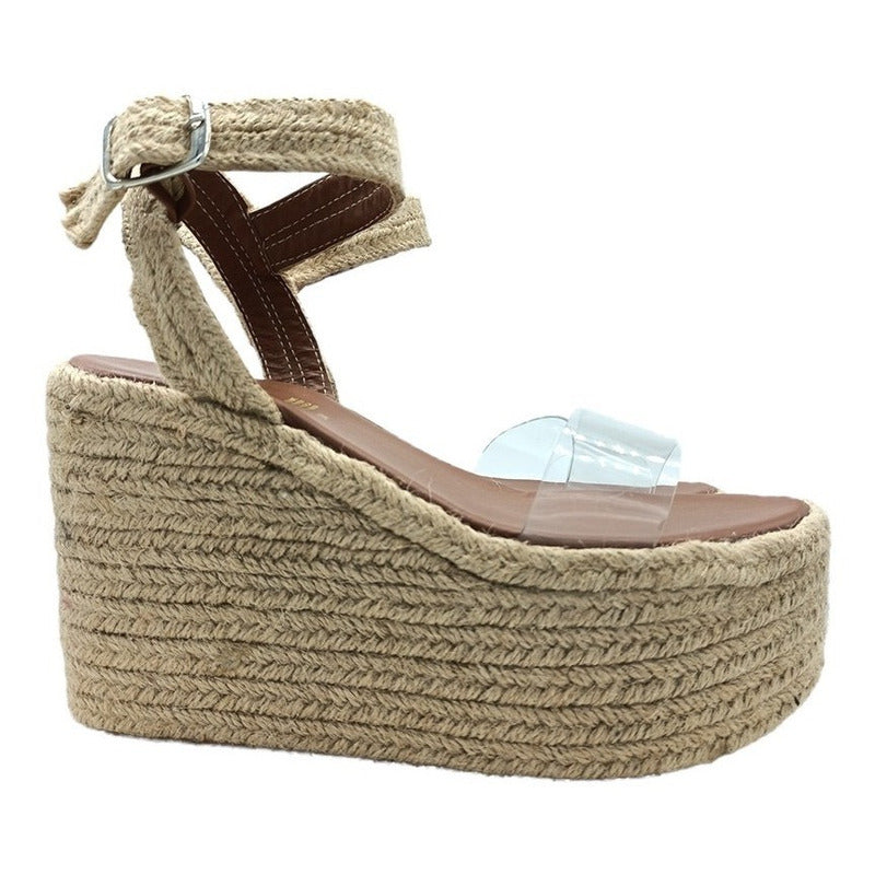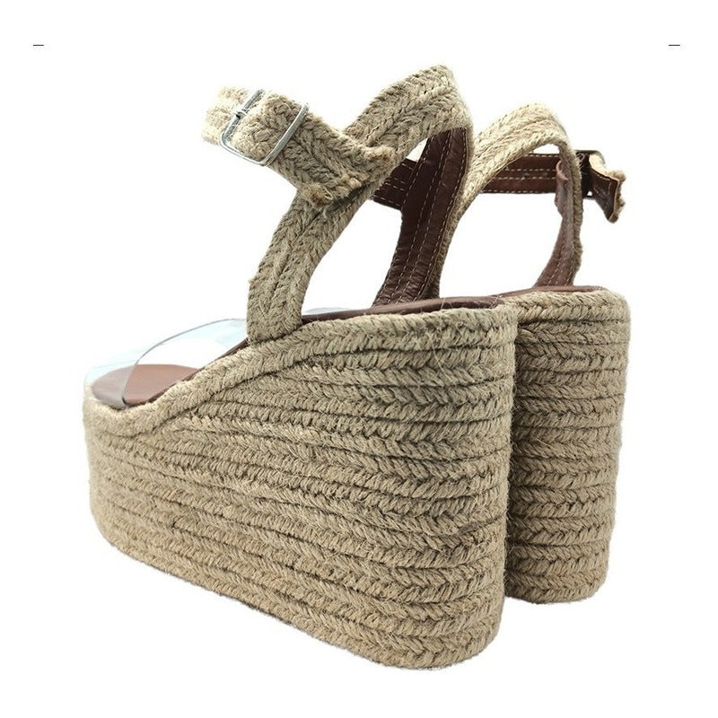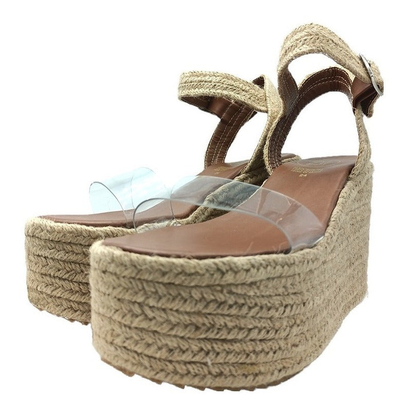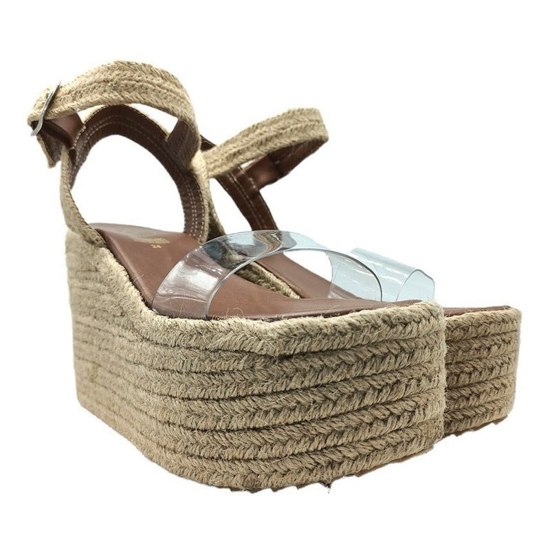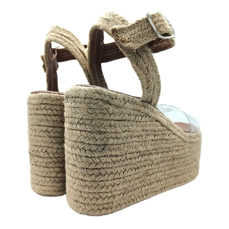 Zapato tipo sandalia con plataforma forrada de Yute. Con látigo al tobillo de yute y al frente mica transparente. Acabada en punta redondeada. Altura de la cuña (incluida la suela): 11 cm / 4.3''