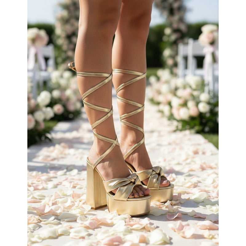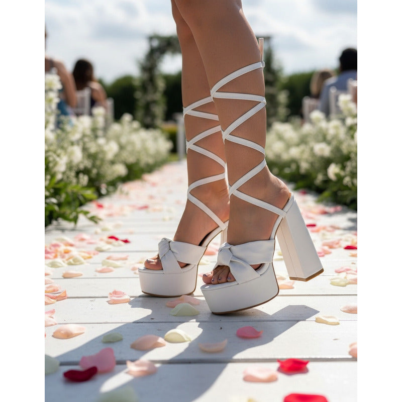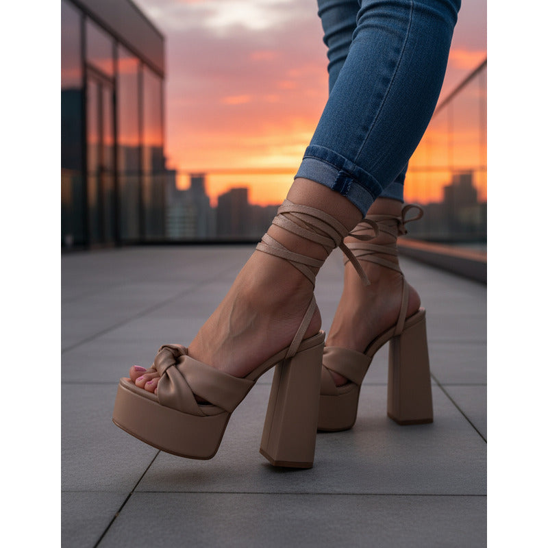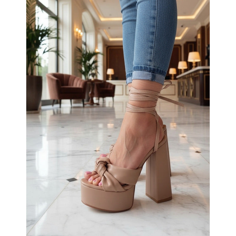 HERMOSAS Y COMODAS SANDALIAS ALTAS CON PLATAFORMA TACON ANCHO CON DETALLE DE NUDO Y TIRAS PARA AMARRAR. ALTURA: 12 CM