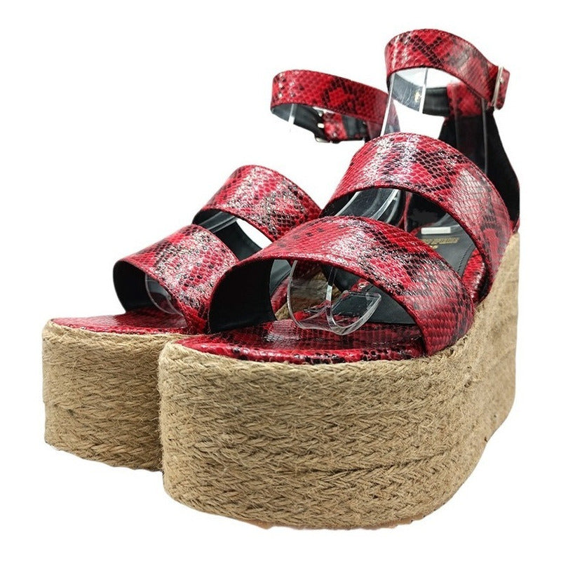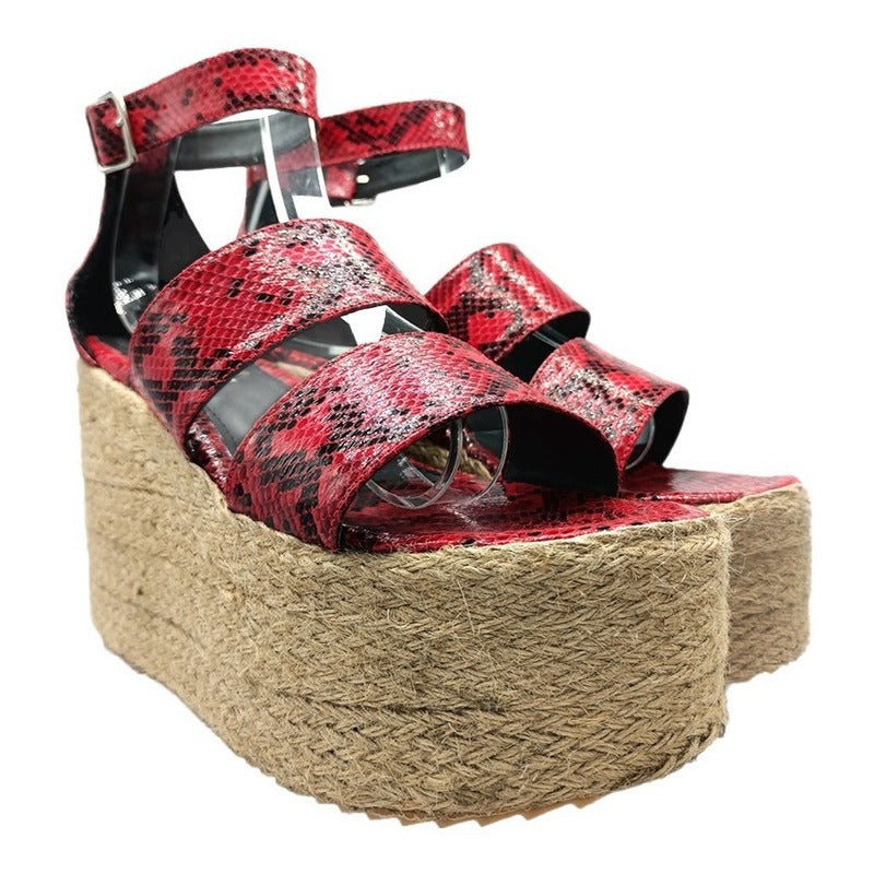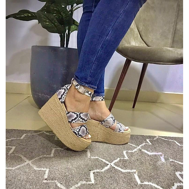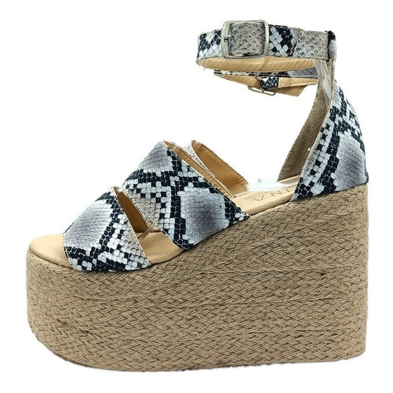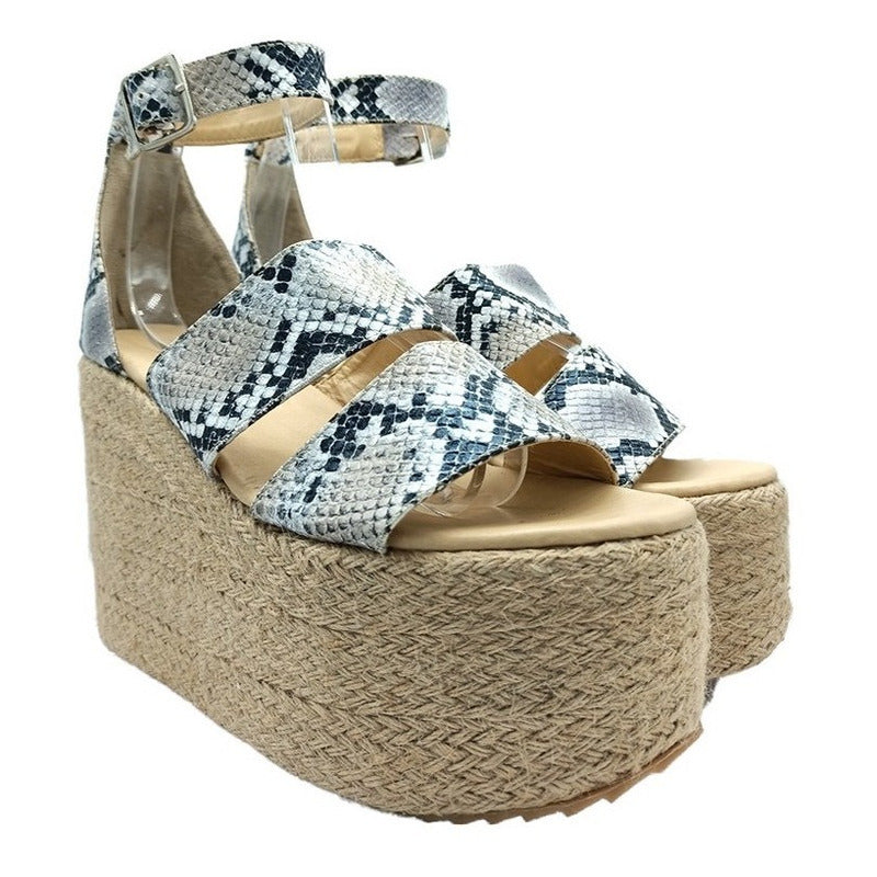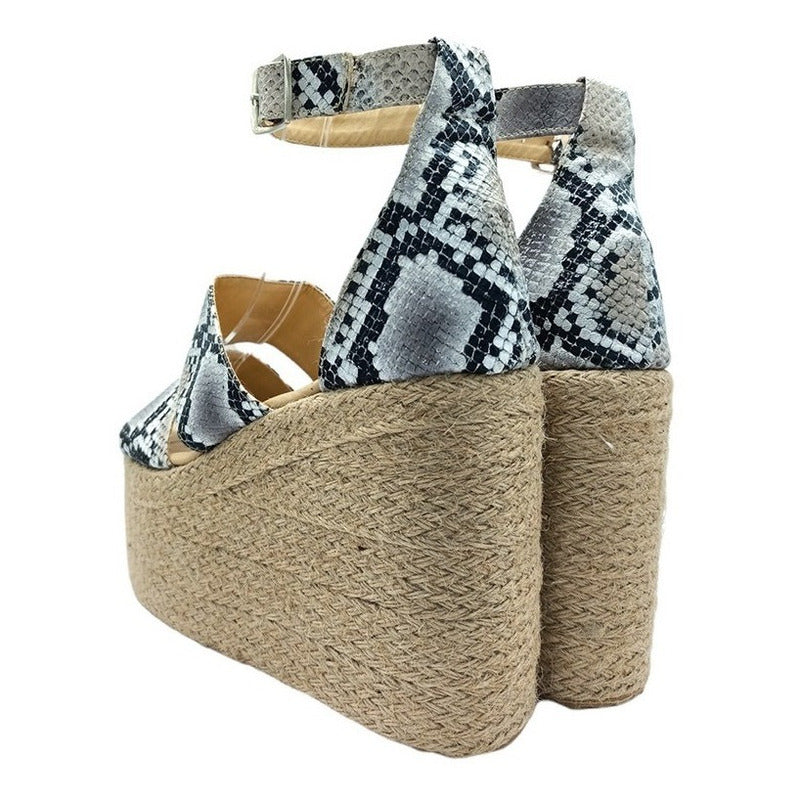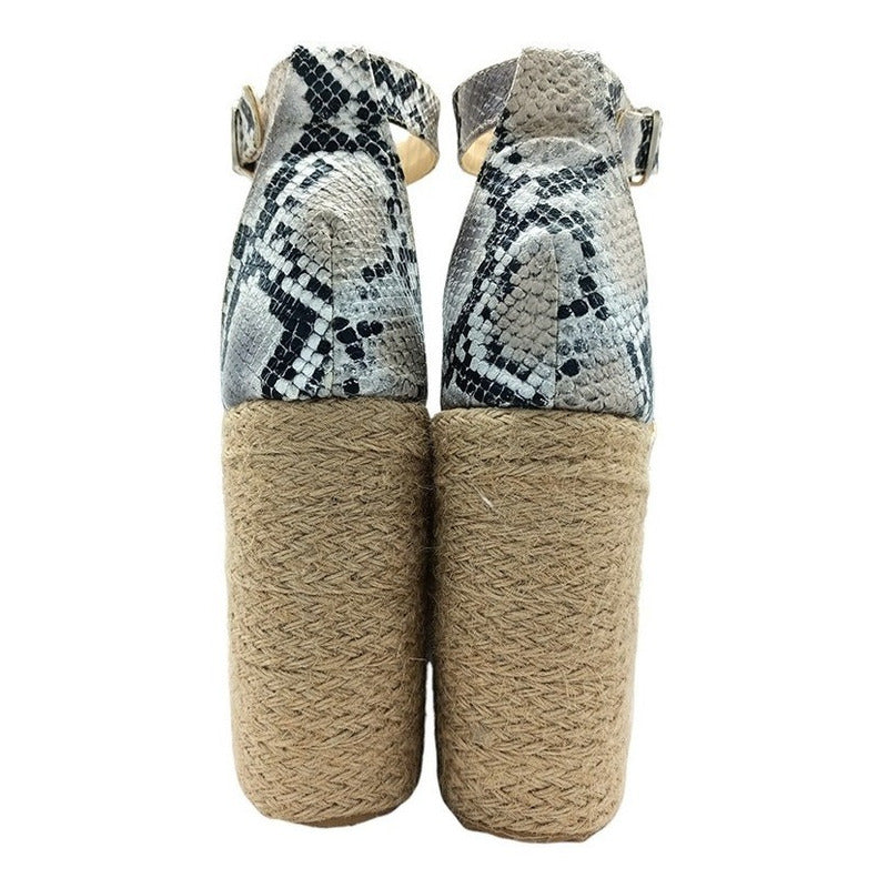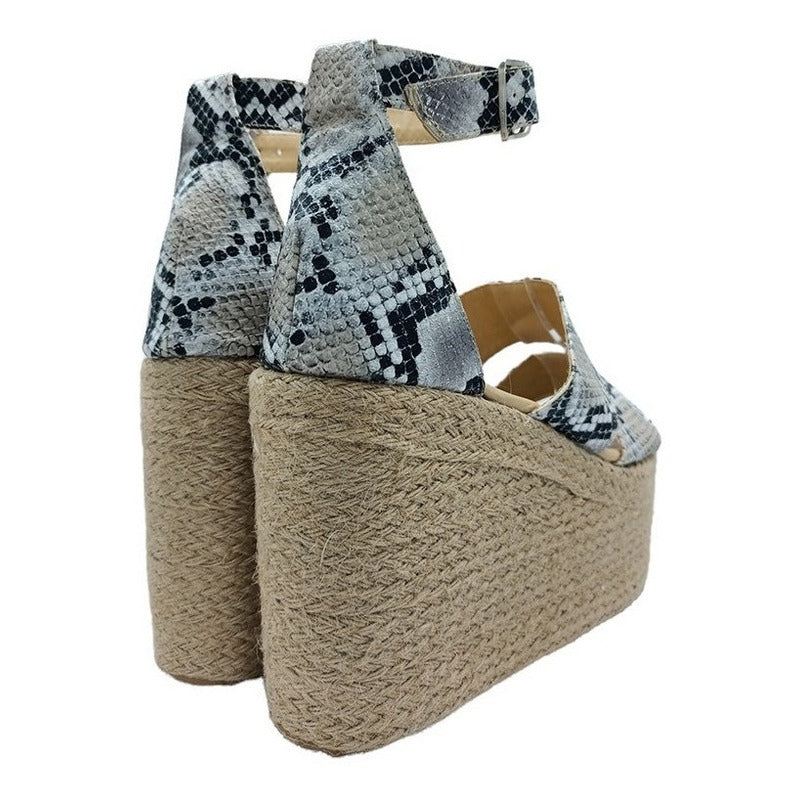 Plataformas forradas de yute con print de serpiente. Altura: Talón de 11 cm. y Puntera de 7 cm. - Material 100% sintético / Yute natural - Excelente calidad - Cómodos y confortables por dentro - Altura: Talón de 11 cm y Puntera de7 cm.