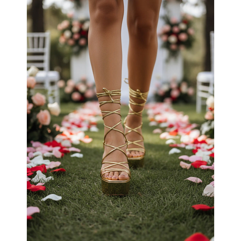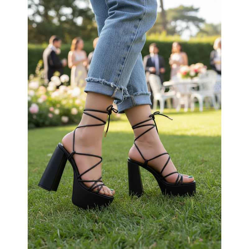 Hermosas y cómodas sandalias altas de tiras/lazo de amarrar en tobillo o tipo gladiador con plataforma. ESPECÍFICACIONES: Altura tacón: 13 cm Altura tacón: 4 cm Material: piel sintética Material lazo: Piola sintética Punta: Cuadrada Hechas a mano con los mejores estándares de calidad