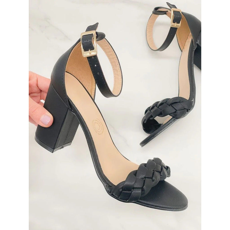 HERMOSAS Y ELEGANTES ZAPATILLAS/ SANDALIAS ALTAS DE TACON CUADRADO DETALLE DE TIRA TRENZADA ALTURA 8.5 CM