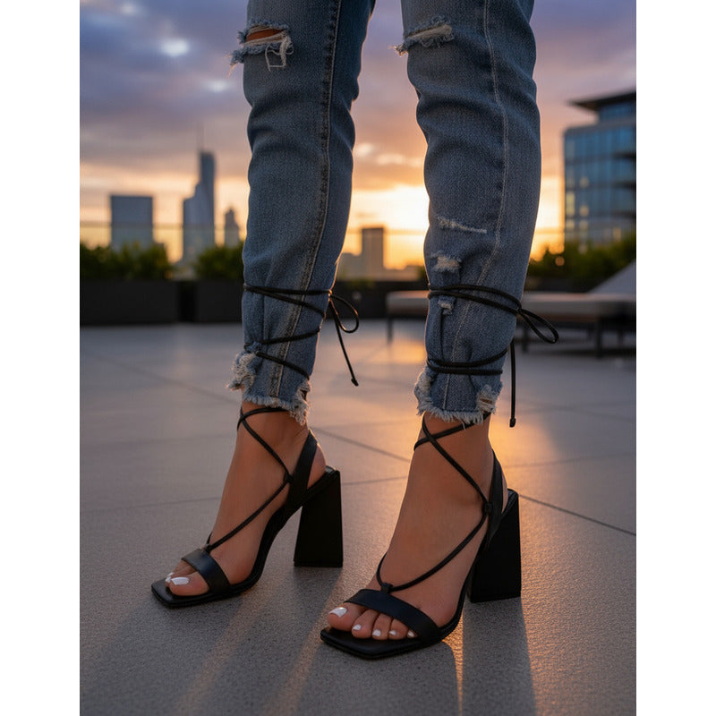 Zapatillas Sandalia De Tacón Triangulo Tiras Con Lazo