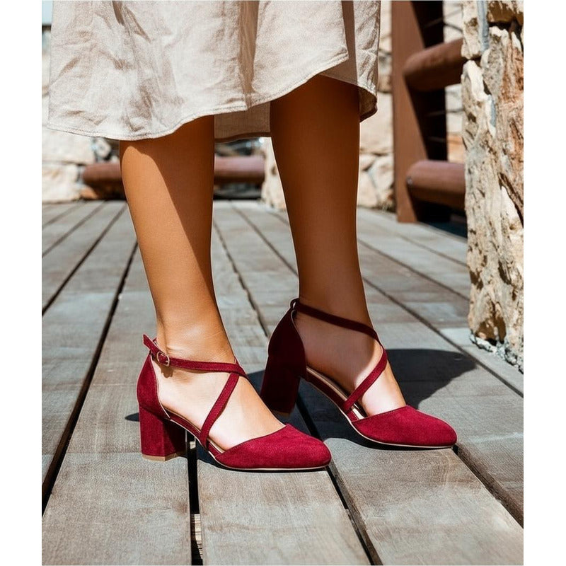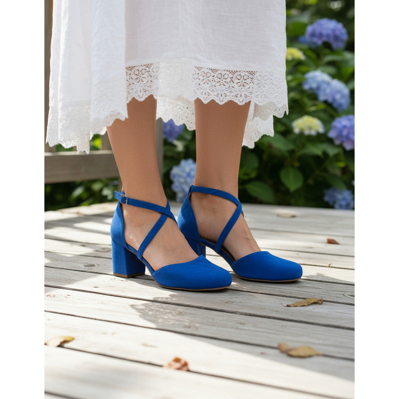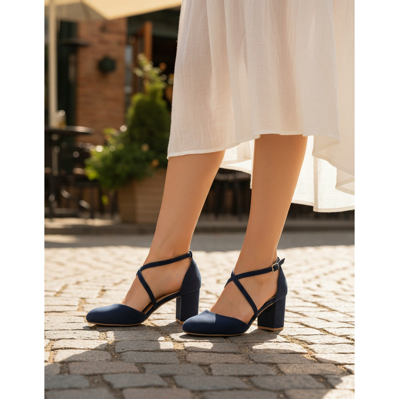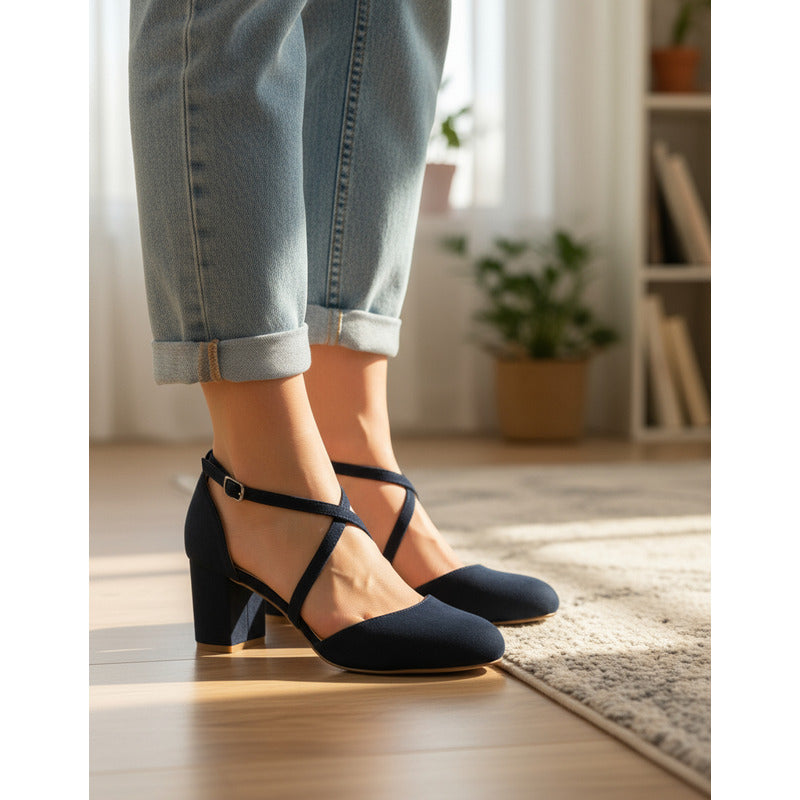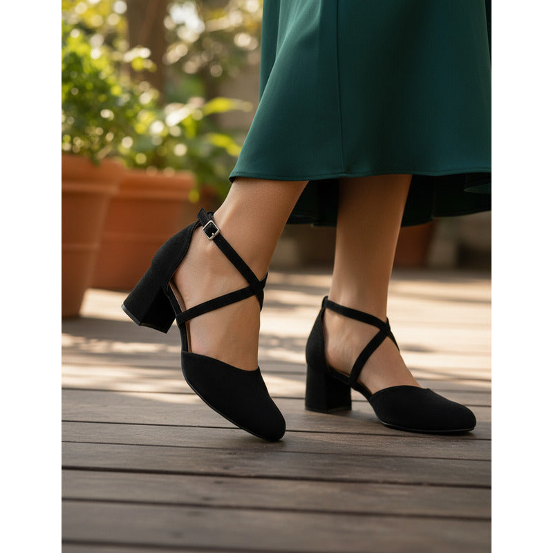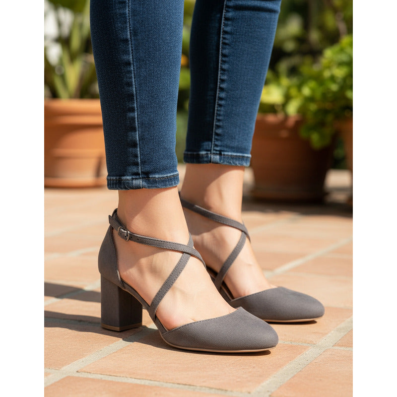 Su diseño con tirantes cruzados estiliza el empeine y aporta un ajuste seguro, mientras que su tacón de 6 cms ofrece estabilidad y confort en cada paso. La punta semi-fina alarga visualmente la silueta del pie sin sacrificar comodidad.