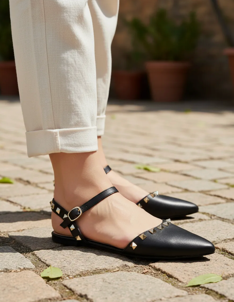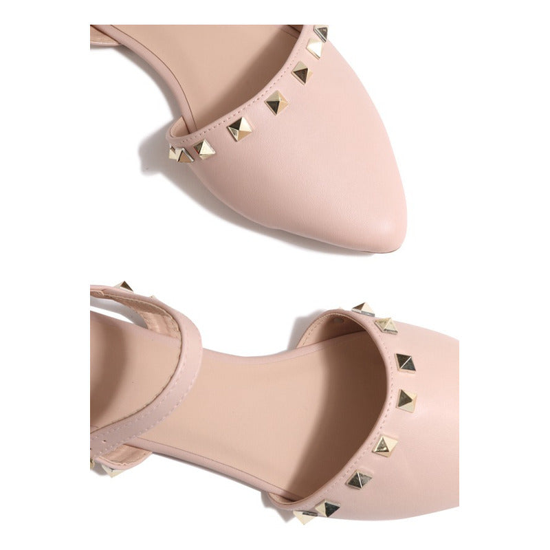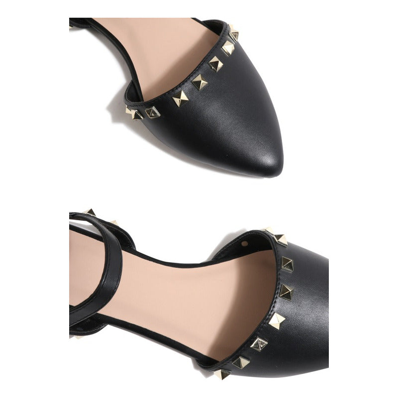 El modelo Milena combina la delicadeza de una bailarina con el carácter de detalles metálicos tipo estoperol, logrando un balance perfecto entre elegancia y fuerza visual. Su punta fina estiliza el pie, mientras que la correa ajustable al tobillo asegura un calce cómodo y seguro.
