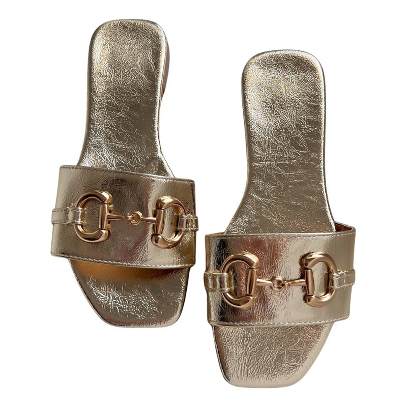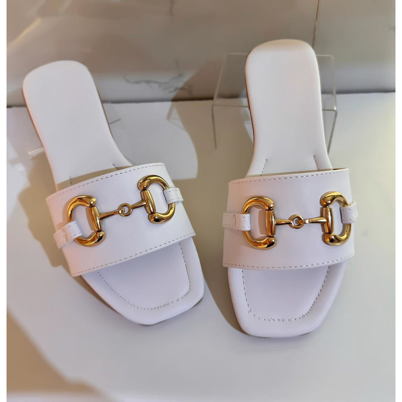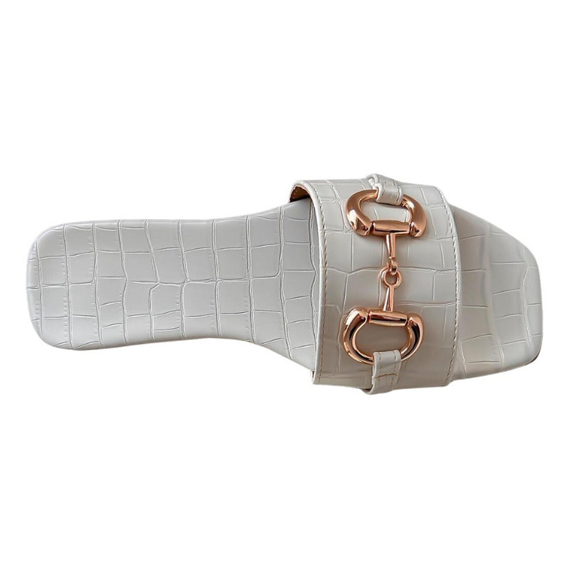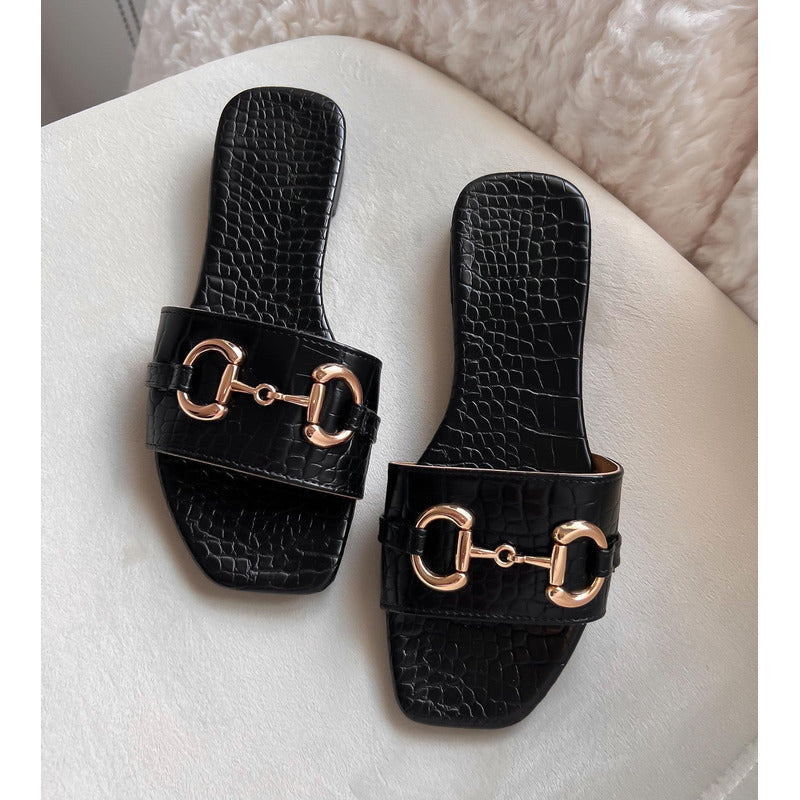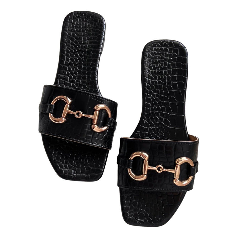 El modelo Harper es la sandalia perfecta para quienes aman el estilo sofisticado y atemporal. Su diseño tipo flat con acabado efecto piel croco aporta textura y elegancia, mientras que el detalle metálico tipo horsebit en tono dorado eleva por completo el look, dándole un aire clásico y muy chic.