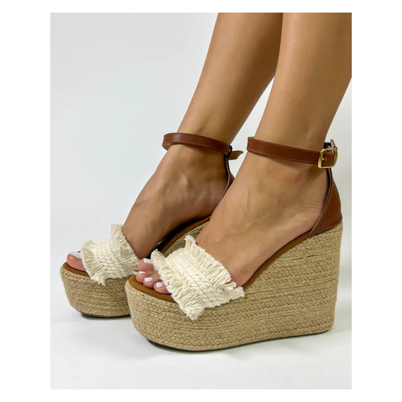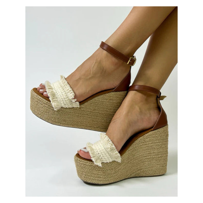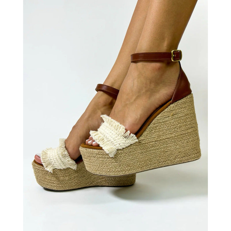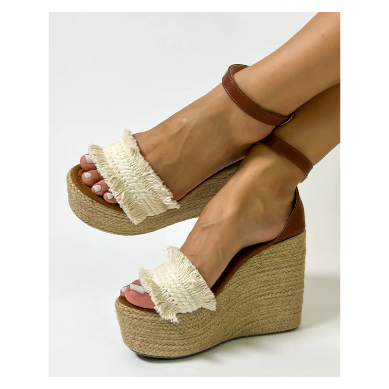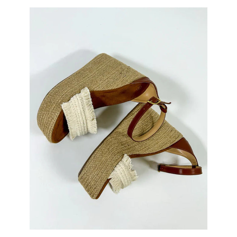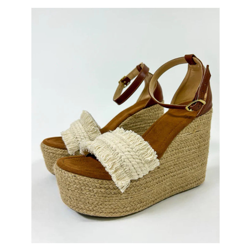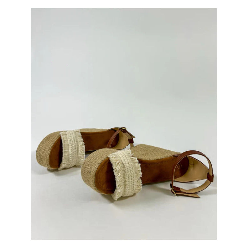 El modelo Yarely combina la esencia natural del yute con detalles artesanales que hacen único cada par. Su plataforma alta completamente forrada en yute tejido aporta un look fresco y veraniego, mientras que la tira frontal con acabado trenzado y flecos añade un toque boho chic irresistible.
