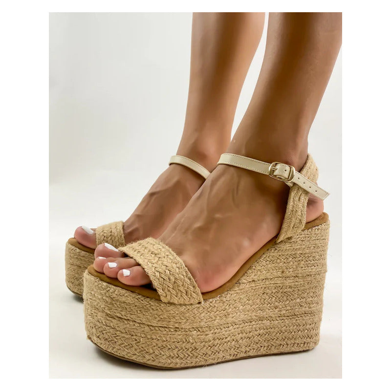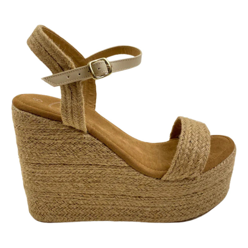 La tira frontal y el talón están elaborados en tejido de yute suave, mientras que la correa ajustable en tono neutro brinda un contraste elegante y asegura un ajuste firme y cómodo. Su diseño estiliza la figura sin sacrificar estabilidad, permitiéndote caminar con seguridad en cualquier ocasión.